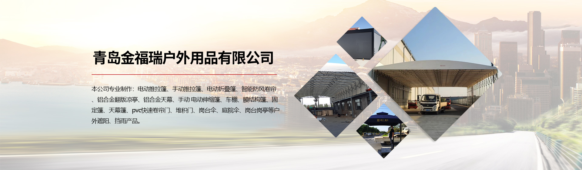 青島金福瑞戶外用品有限公司是一家專業從事生產、研發、銷售為一體的主營推拉篷、電動推拉篷、大型雨棚、戶外倉儲雨棚、智能防風卷簾、智能涼亭、快速門、戶外遮陽擋雨產品的公司,我司創立于2011年,位于美麗的海邊城市——青島。本公司專業制作:推拉篷、電動推拉篷、大型雨棚、戶外倉儲雨棚、電動折疊篷、智能防風卷簾、鋁合金翻版涼亭、pvc快速門、堆積門、膜結構篷、車棚、曲臂篷、固定篷、崗臺傘、庭院傘等戶外遮陽、擋雨產品以及各種崗臺、崗亭。我們注重產品的質量與服務,為廣大客戶的需求提供完善的解決方案。可根據您的需求為您量身定做,以經濟實用、自然、唯美、時尚為追求,全心全意為熱愛生活、熱海事業的您尋找不一樣的感觸與享受。...